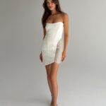 גזרת מיני הסטרית ועכשווית,בד מחטב,סגירה עם רוכסן בגב,שילוב של שרשראות בצד השמלה